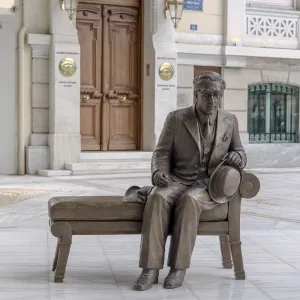Tο γλυπτό που απεικονίζει τον Κ. Π. Καβάφη, έργο του γλύπτη Πραξιτέλη Τζανουλίνου, στον πεζόδρομο της Διονυσίου Αρεοπαγίτου, μπροστά από την Ωνάσειο Βιβλιοθήκη και την Onassis Mandra.