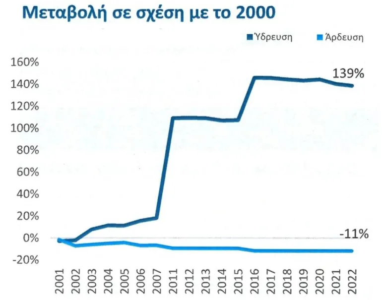 Καταγράφει υπερδιπλασιασμό (+139%) των απολήψεων νερού για ύδρευση την περίοδο 2001-2022, εξαιτίας, μεταξύ άλλων λόγων, και της αυξημένης τουριστικής κίνησης. Ο υπερδιπλασιασμός των απολήψεων νερού για ύδρευση οφείλεται αφενός στο συνδυασμό της αύξησης της τουριστικής κίνησης και της ανόδου τής κατά κεφαλήν κατανάλωσης αλλά και αφετέρου στις μεγάλες -της τάξης του 50%- απώλειες από τα δίκτυα διανομής. Το πρόβλημα είναι ακόμα μεγαλύτερο σε περιοχές με αυξημένες τουριστικές ροές (όπως λόγου χάριν οι Κυκλάδες) όπου η κατανάλωση αυξάνεται ενώ η διαθεσιμότητα του πόρου είναι πολύ περιορισμένη. Πρόσθετο πρόβλημα δημιουργεί το γεγονός ότι η ζήτηση στους τουριστικούς προορισμούς κορυφώνεται κατά τους θερινούς μήνες, οπότε ανακύπτουν ήδη σε αρκετά νησιά θέματα επάρκειας ενώ καταπονούνται παράλληλα οι υποδομές.