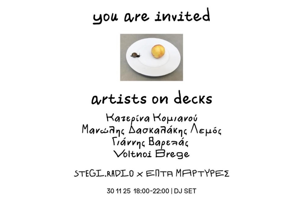 Το DJ session “you are invited: artists on decks” πραγματοποιείται σε συνεργασία με το STEGI.RADIO και το wine bar "Επτά Μάρτυρες", στο πλαίσιο της έκθεσης του Juergen Teller στο Onassis Ready.