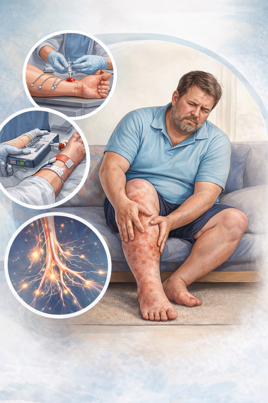 Η θεραπεία εξαρτάται από το αίτιο. Συχνά μπορεί να βελτιωθεί ή να σταθεροποιηθεί και περιλαμβάνει ρύθμιση σακχάρου, απώλεια βάρους, διόρθωση ελλείψεων βιταμινών, αντιμετώπιση θυρεοειδούς, διαχείριση οιδήματος ή λεμφοιδήματος, ειδική φαρμακευτική αγωγή για νευροπαθητικό πόνο, φυσικοθεραπεία και φροντίδα ποδιών. Η πλήρης ίαση δεν είναι πάντα δυνατή, αλλά συνήθως επιτυγχάνεται σημαντική ανακούφιση.